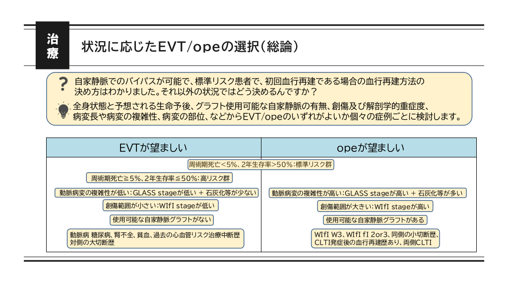 治 療 状況に応じたEVT/opeの選択(総論) 自家静脈でのバイパスが可能で、標準リスク患者で、初回血行再建である場合の血行再建方法の 決め方はわかりました。それ以外の状況ではどう決めるんですか? 全身状態と予想される生命予後、グラフト使用可能な自家静脈の有無、創傷及び解剖学的重症度、 病変長や病変の複雑性、病変の部位、などからEVT/opeのいずれがよいか個々の症例ごとに検討します。 EVTが望ましい opeが望ましい 周術期死亡<5%、2年生存率>50%:標準リスク群 周術期死亡≧5%、2年生存率≦50%:高リスク群 動脈病変の複雑性が低い:GLASS stageが低い + 石灰化等が少ない 動脈病変の複雑性が高い:GLASS stageが高い + 石灰化等が多い 創傷範囲が小さい:WIfI stageが低い 創傷範囲が大きい:WIfI stageが高い 使用可能な自家静脈グラフトがない 使用可能な自家静脈グラフトがある 動脈病 糖尿病、腎不全、貧血、過去の心血管リスク治療中断歴 対側の大切断歴 WIfI W3、WIfI fI 2or3、同側の小切断歴、 CLTI発症後の血行再建歴あり、両側CLTI 下肢動脈におけるEVT/opeの選択 #20.