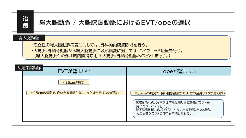 治 療 総大腿動脈 / 大腿膝窩動脈におけるEVT/opeの選択 総大腿動脈 ・孤立性の総大腿動脈病変に対しては、外科的内膜摘除術を行う。 ・大動脈/外腸骨動脈から総大腿動脈に及ぶ病変に対しては、ハイブリッド治療を行う。 (総大腿動脈への外科的内膜摘除術 +大動脈/外腸骨動脈へのEVTを行う。) 大腿膝窩動脈 EVTが望ましい opeが望ましい <25cmの病変 ≧25cmの病変で、良い自家静脈がない、または全身リスクが高い ≧25cmの病変で、良い自家静脈があり、かつ全身リスクが高くない ・膝窩動脈へのバイパスは可能な限り自家静脈グラフトを 用いたバイパスを行う。 ・膝下膝窩動脈へのバイパスで、良い自家静脈がない場合、 人工血管グラフトの使用を考慮しても良い。 #21.