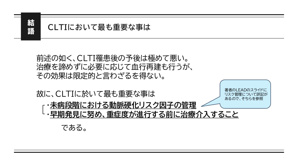 結 語 CLTIにおいて最も重要な事は 前述の如く、CLTI罹患後の予後は極めて悪い。 治療を諦めずに必要に応じて血行再建も行うが、 その効果は限定的と言わざるを得ない。 故に、CLTIに於いて最も重要な事は 著者のLEADのスライドに リスク管理について詳記が あるので、そちらを参照 ・未病段階における動脈硬化リスク因子の管理 ・早期発見に努め、重症度が進行する前に治療介入すること である。 治療の重要性と未病段階の管理 #23.