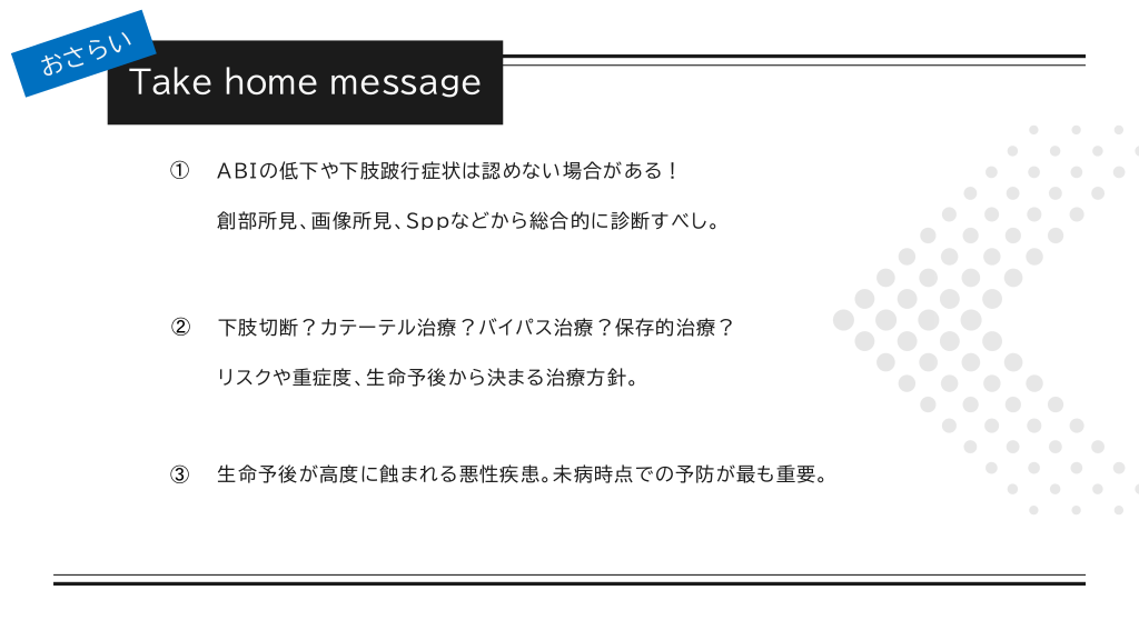 Take home message ① ABIの低下や下肢跛行症状は認めない場合がある! 創部所見、画像所見、Sppなどから総合的に診断すべし。 ② 下肢切断?カテーテル治療?バイパス治療?保存的治療? リスクや重症度、生命予後から決まる治療方針。 ③ 生命予後が高度に蝕まれる悪性疾患。未病時点での予防が最も重要。