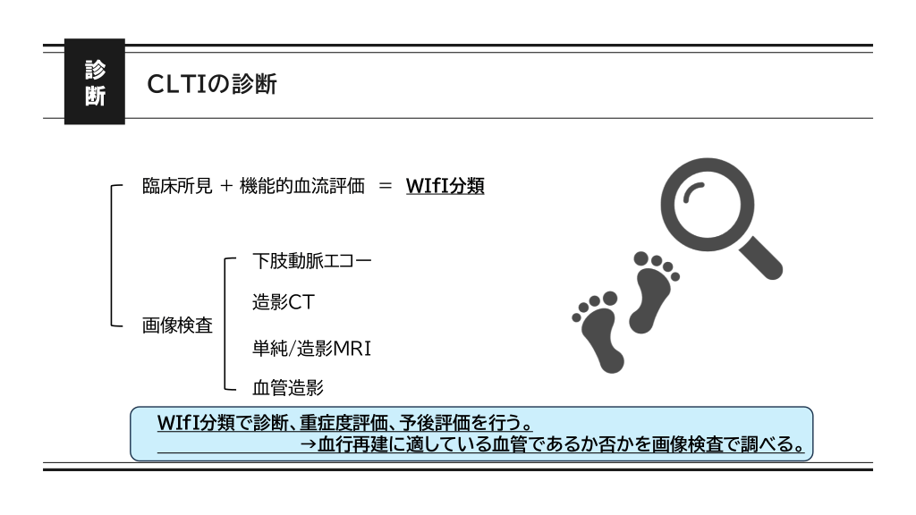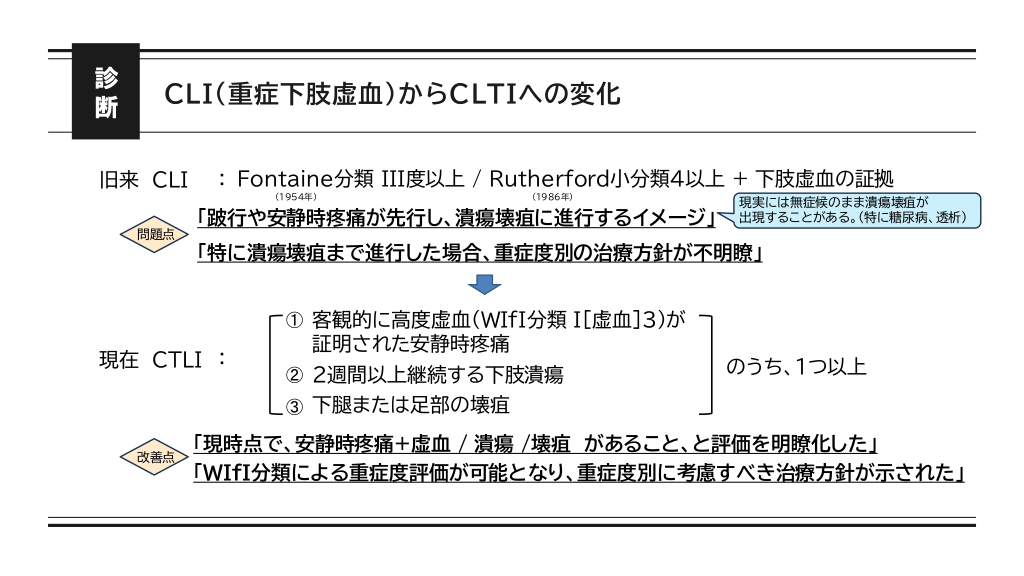 診 断 CLI(重症下肢虚血)からCLTIへの変化 旧来 CLI : Fontaine分類 III度以上 / Rutherford小分類4以上 + 下肢虚血の証拠 (1954年) (1986年) 「跛行や安静時疼痛が先行し、潰瘍壊疽に進行するイメージ」 現実には無症候のまま潰瘍壊疽が 出現することがある。(特に糖尿病、透析) 問題点 「特に潰瘍壊疽まで進行した場合、重症度別の治療方針が不明瞭」 ① 客観的に高度虚血(WIfI分類 I[虚血]3)が 現在 CTLI : 証明された安静時疼痛 ② 2週間以上継続する下肢潰瘍 のうち、1つ以上 ③ 下腿または足部の壊疽 改善点 「現時点で、安静時疼痛+虚血 / 潰瘍 /壊疽 があること、と評価を明瞭化した」 「WIfI分類による重症度評価が可能となり、重症度別に考慮すべき治療方針が示された」 #6.