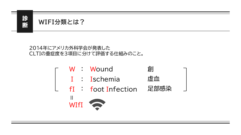 診 断 WIFI分類とは? 2014年にアメリカ外科学会が発表した CLTIの重症度を3項目に分けて評価する仕組みのこと。 W : Wound 創 I : Ischemia 虚血 fI : foot Infection 足部感染 = WIfI #8.