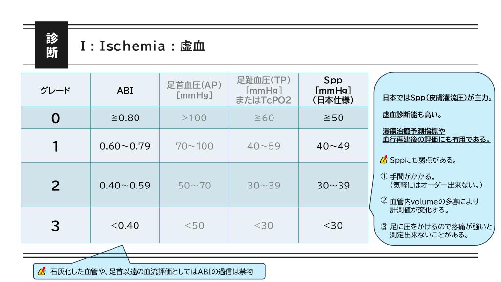 診 断 I : Ischemia : 虚血 グレード ABI 足首血圧(AP) [mmHg] 0 ≧0.80 >100 1 0.60~0.79 70~100 足趾血圧(TP) [mmHg] またはTcPO2 Spp [mmHg] (日本仕様) ≧60 ≧50 40~59 40~49 日本ではSpp(皮膚灌流圧)が主力。 虚血診断能も高い。 潰瘍治癒予測指標や 血行再建後の評価にも有用である。 Sppにも弱点がある。 2 0.40~0.59 50~70 30~39 30~39 ① 手間がかかる。 (気軽にはオーダー出来ない。) ② 血管内volumeの多寡により 計測値が変化する。 3 <0.40 <50 石灰化した血管や、足首以遠の血流評価としてはABIの過信は禁物 <30 <30 ③ 足に圧をかけるので疼痛が強いと 測定出来ないことがある。 #10.