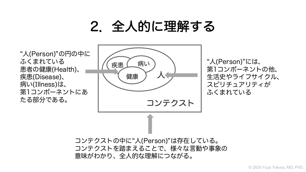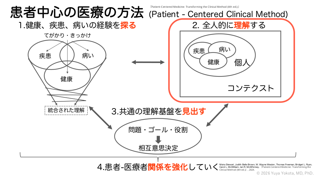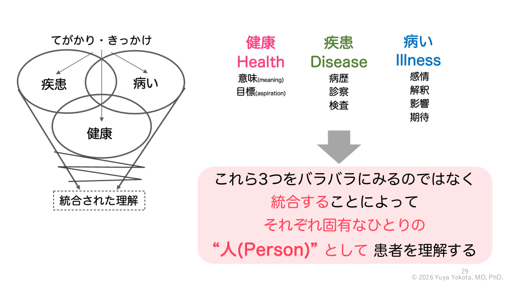 1.健康、疾患、病いの経験を探る 患者・家族との対話や関わりの中 で様々な「てがかり」や「きっか け」がある。 「てがかり」や「きっかけ」から、 患者の健康(Health)、疾患 (Disease)、病い(Illness)を知る。 実際の診療においては、患者の健康 (Health)、疾患(Disease)、病い(Illness) をそれぞれ順番に捉えていくのではなく、 図ではギザギザで表現されているように、 それぞれを行ったりきたりする。 患者の健康(Health)、疾患(Disease)、 病い(Illness)を個別に理解するだけで終 わらず、統合していくことで、ひとりの “人(Person)”として患者を理解する。 © 2026 Yuya Yokota, MD, PhD. #24.