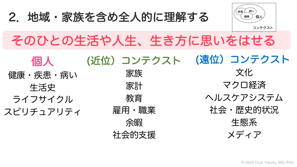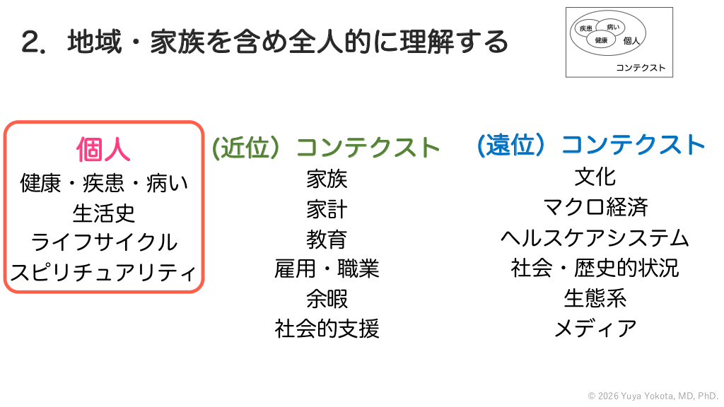 2.地域・家族を含め全人的に理解する そのひとの生活や人生、生き方に思いをはせる 個人 (近位)コンテクスト (遠位)コンテクスト 健康・疾患・病い 生活史 ライフサイクル スピリチュアリティ 家族 家計 教育 雇用・職業 余暇 社会的支援 文化 マクロ経済 ヘルスケアシステム 社会・歴史的状況 生態系 メディア © 2026 Yuya Yokota, MD, PhD. #42.