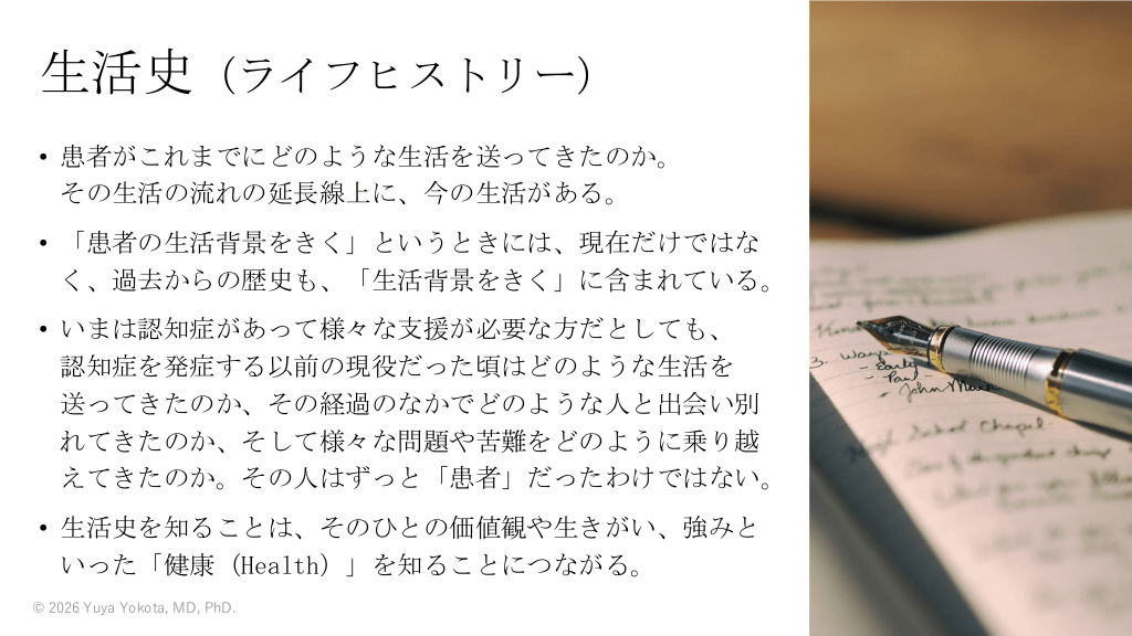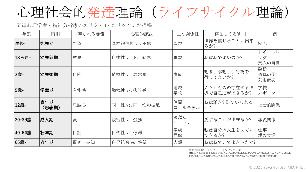 生活史(ライフヒストリー) • 患者がこれまでにどのような生活を送ってきたのか。 その生活の流れの延長線上に、今の生活がある。 • 「患者の生活背景をきく」というときには、現在だけではな く、過去からの歴史も、「生活背景をきく」に含まれている。 • いまは認知症があって様々な支援が必要な方だとしても、 認知症を発症する以前の現役だった頃はどのような生活を 送ってきたのか、その経過のなかでどのような人と出会い別 れてきたのか、そして様々な問題や苦難をどのように乗り越 えてきたのか。その人はずっと「患者」だったわけではない。 • 生活史を知ることは、そのひとの価値観や生きがい、強みと いった「健康(Health)」を知ることにつながる。 © 2026 Yuya Yokota, MD, PhD. #34. 心理社会的発達理論(ライフサイクル理論) 発達心理学者・精神分析家のエリク・H・エリクソンが提唱 年齢 時期 導かれる要素 ⼼理的課題 主な関係性 存在しうる質問 例 世界を信じることは出来 授乳 るか? トイレトレーニ 私は私でよいのか? ング 更⾐の⾃律 探検 動き、移動し、⾏為を 道具の使⽤ ⾏ってよいか? 芸術表現 ⽣後- 乳児期 希望 基本的信頼 vs. 不信 ⺟親 18ヵ⽉- 幼児前期 意思 ⾃律性 vs. 恥、疑惑 両親 3歳- 幼児後期 ⽬的 積極性 vs. 罪悪感 家族 5歳- 学童期 有能感 勤勉性 vs. 劣等感 地域 学校 12歳- ⻘年期 (思春期) 忠誠⼼ 同⼀性 vs. 同⼀性の拡散 仲間 私は誰か? 誰でいられる ロールモデル か? 社会的関係 20-39歳 成⼈期 愛 親密性 vs. 孤独 友だち パートナー 愛することが出来るか? 恋愛関係 40-64歳 壮年期 世話 世代性 vs. 停滞 家族 同僚 私は⾃分の⼈⽣をあてに 仕事 できるか? 親の⽴場 65歳- ⽼年期 賢さ・英知 ⾃⼰統合 vs. 絶望 ⼈類 私は私でいてよかったか? ⼈々とものの存在する世 学校 界で⾃⼰成就できるか? スポーツ 表は wikiedia 「エリク・H・エリクソン」より https://ja.wikipedia.org/wiki/%E3%82%A8%E3%83%AA%E3%82%AF%E3%83%BBH%E 3%83%BB%E3%82%A8%E3%83%AA%E3%82%AF%E3%82%BD%E3%83%B3 © 2026 Yuya Yokota, MD, PhD. #35.