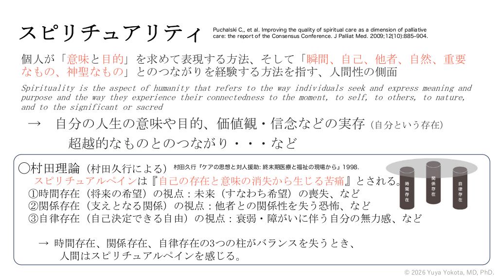 スピリチュアリティ Puchalski C,, et al. Improving the quality of spiritual care as a dimension of palliative care: the report of the Consensus Conference. J Palliat Med. 2009;12(10):885‒904. 個人が「意味と目的」を求めて表現する方法、そして「瞬間、自己、他者、自然、重要 なもの、神聖なもの」とのつながりを経験する方法を指す、人間性の側面 Spirituality is the aspect of humanity that refers to the way individuals seek and express meaning and purpose and the way they experience their connectedness to the moment, to self, to others, to nature, and to the significant or sacred → 自分の人生の意味や目的、価値観・信念などの実存(自分という存在) 超越的なものとのつながり・・・など ◯村田理論(村田久行による)村田久行『ケアの思想と対人援助: 終末期医療と福祉の現場から』1998. スピリチュアルペインは『自己の存在と意味の消失から生じる苦痛』とされる。 ①時間存在(将来の希望)の視点:未来(すなわち希望)の喪失、など ②関係存在(支えとなる関係)の視点:他者との関係性を失う恐怖、など ③自律存在(自己決定できる自由)の視点:衰弱・障がいに伴う自分の無力感、など → 時間存在、関係存在、自律存在の3つの柱がバランスを失うとき、 人間はスピリチュアルペインを感じる。 © 2026 Yuya Yokota, MD, PhD. 健康の社会的決定要因とその影響 #36.