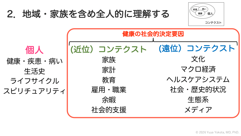 2.地域・家族を含め全人的に理解する 個人 (近位)コンテクスト (遠位)コンテクスト 健康・疾患・病い 生活史 ライフサイクル スピリチュアリティ 家族 家計 教育 雇用・職業 余暇 社会的支援 文化 マクロ経済 ヘルスケアシステム 社会・歴史的状況 生態系 メディア © 2026 Yuya Yokota, MD, PhD. #32.