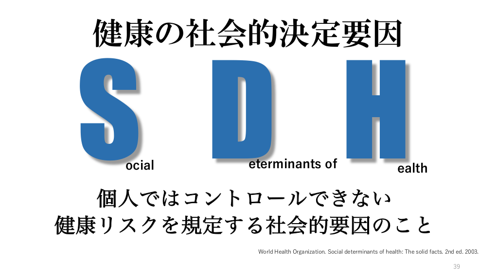 2.地域・家族を含め全人的に理解する 健康の社会的決定要因 個人 (近位)コンテクスト (遠位)コンテクスト 健康・疾患・病い 生活史 ライフサイクル スピリチュアリティ 家族 家計 教育 雇用・職業 余暇 社会的支援 文化 マクロ経済 ヘルスケアシステム 社会・歴史的状況 生態系 メディア © 2026 Yuya Yokota, MD, PhD. #38.