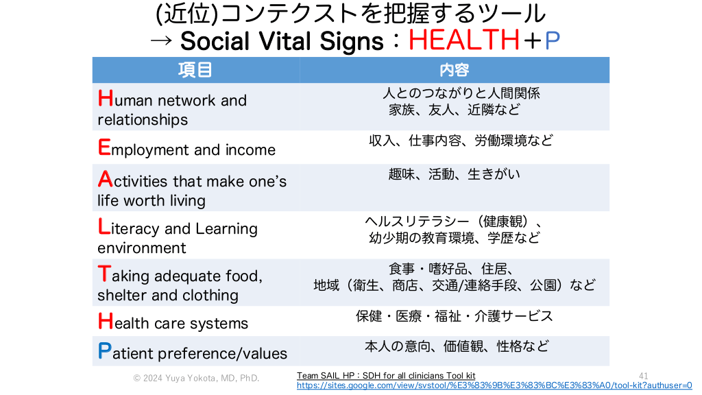 健康の社会的決定要因 S D H ocial eterminants of ealth 個人ではコントロールできない 健康リスクを規定する社会的要因のこと World Health Organization. Social determinants of health: The solid facts. 2nd ed. 2003. 39 #40. (近位)コンテクストを把握するツール → Social Vital Signs:HEALTH+P 項目 Human network and relationships Employment and income Activities that make oneʼs 内容 人とのつながりと人間関係 家族、友人、近隣など 収入、仕事内容、労働環境など 趣味、活動、生きがい life worth living Literacy and Learning environment Taking adequate food, shelter and clothing Health care systems Patient preference/values © 2024 Yuya Yokota, MD, PhD. ヘルスリテラシー(健康観)、 幼少期の教育環境、学歴など 食事・嗜好品、住居、 地域(衛生、商店、交通/連絡手段、公園)など 保健・医療・福祉・介護サービス 本人の意向、価値観、性格など Team SAIL HP:SDH for all clinicians Tool kit 41 https://sites.google.com/view/svstool/%E3%83%9B%E3%83%BC%E3%83%A0/tool-kit?authuser=0 患者中心の医療の方法と実践例 #41.