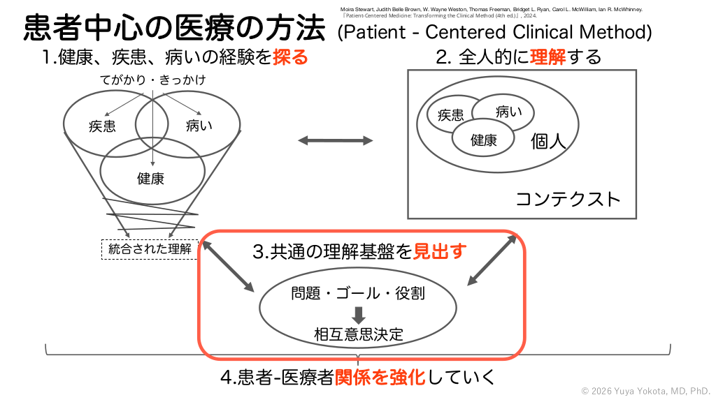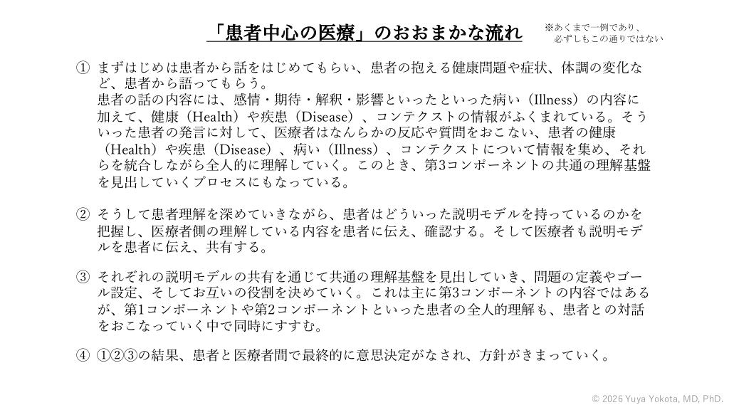 「患者中心の医療」のおおまかな流れ ※あくまで一例であり、 必ずしもこの通りではない ① まずはじめは患者から話をはじめてもらい、患者の抱える健康問題や症状、体調の変化な ど、患者から語ってもらう。 患者の話の内容には、感情・期待・解釈・影響といったといった病い(Illness)の内容に 加えて、健康(Health)や疾患(Disease)、コンテクストの情報がふくまれている。そう いった患者の発⾔に対して、医療者はなんらかの反応や質問をおこない、患者の健康 (Health)や疾患(Disease)、病い(Illness)、コンテクストについて情報を集め、それ らを統合しながら全⼈的に理解していく。このとき、第3コンポーネントの共通の理解基盤 を⾒出していくプロセスにもなっている。 ② そうして患者理解を深めていきながら、患者はどういった説明モデルを持っているのかを 把握し、医療者側の理解している内容を患者に伝え、確認する。そして医療者も説明モデ ルを患者に伝え、共有する。 ③ それぞれの説明モデルの共有を通じて共通の理解基盤を⾒出していき、問題の定義やゴー ル設定、そしてお互いの役割を決めていく。これは主に第3コンポーネントの内容ではある が、第1コンポーネントや第2コンポーネントといった患者の全⼈的理解も、患者との対話 をおこなっていく中で同時にすすむ。 ④ ①②③の結果、患者と医療者間で最終的に意思決定がなされ、⽅針がきまっていく。 © 2026 Yuya Yokota, MD, PhD. #63.