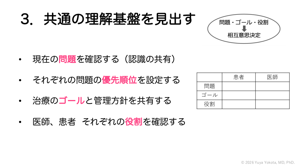 3.共通の理解基盤を見出す • • 現在の問題を確認する(認識の共有) それぞれの問題の優先順位を設定する • 治療のゴールと管理方針を共有する • 医師、患者 それぞれの役割を確認する 患者 医師 問題 ゴール 役割 © 2026 Yuya Yokota, MD, PhD. #44.