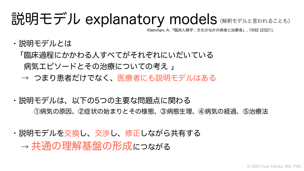説明モデル explanatory models (解釈モデルと言われることも) Kleinman, A.『臨床人類学 ; 文化のなかの病者と治療者』, 1992 (2021). ・説明モデルとは 「臨床過程にかかわる人すべてがそれぞれにいだいている 病気エピソードとその治療についての考え 」 → つまり患者だけでなく、医療者にも説明モデルはある ・説明モデルは、以下の5つの主要な問題点に関わる ①病気の原因、②症状の始まりとその様態、③病態生理、④病気の経過、⑤治療法 ・説明モデルを交換し、交渉し、修正しながら共有する → 共通の理解基盤の形成につながる © 2026 Yuya Yokota, MD, PhD. #45.
