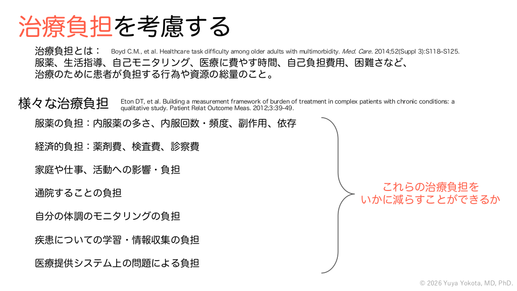 治療負担を考慮する 治療負担とは: Boyd C.M., et al. Healthcare task difficulty among older adults with multimorbidity. Med. Care. 2014;52(Suppl 3):S118‒S125. 服薬、生活指導、自己モニタリング、医療に費やす時間、自己負担費用、困難さなど、 治療のために患者が負担する行為や資源の総量のこと。 様々な治療負担 Eton DT, et al. Building a measurement framework of burden of treatment in complex patients with chronic conditions: a qualitative study. Patient Relat Outcome Meas. 2012;3:39-49. 服薬の負担:内服薬の多さ、内服回数・頻度、副作用、依存 経済的負担:薬剤費、検査費、診察費 家庭や仕事、活動への影響・負担 通院することの負担 これらの治療負担を いかに減らすことができるか 自分の体調のモニタリングの負担 疾患についての学習・情報収集の負担 医療提供システム上の問題による負担 © 2026 Yuya Yokota, MD, PhD. #46.