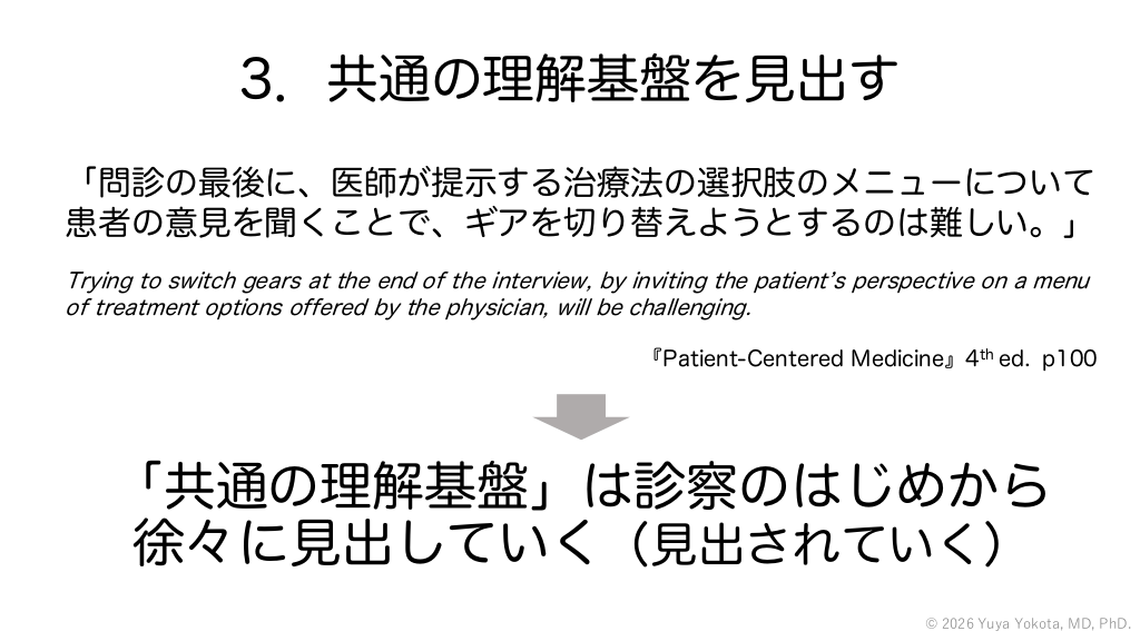 3.共通の理解基盤を見出す 「問診の最後に、医師が提示する治療法の選択肢のメニューについて 患者の意見を聞くことで、ギアを切り替えようとするのは難しい。」 Trying to switch gears at the end of the interview, by inviting the patientʼs perspective on a menu of treatment options offered by the physician, will be challenging. 『Patient-Centered Medicine』4th ed. p100 「共通の理解基盤」は診察のはじめから 徐々に見出していく(見出されていく) © 2026 Yuya Yokota, MD, PhD. #47.