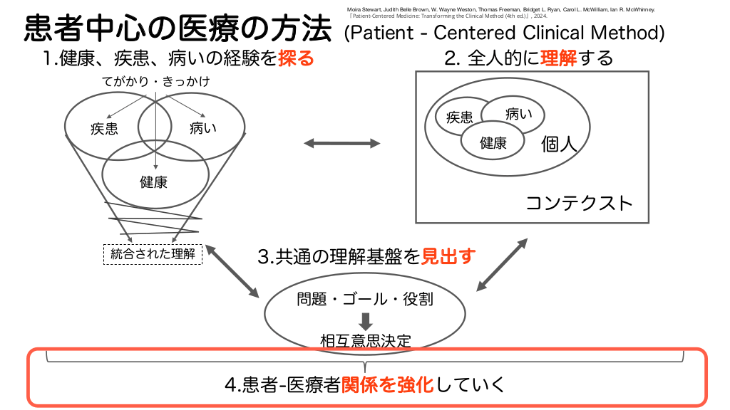 患者中心の医療の方法 1.健康、疾患、病いの経験を探る Moira Stewart, Judith Belle Brown, W. Wayne Weston, Thomas Freeman, Bridget L. Ryan, Carol L. McWilliam, Ian R. McWhinney. 『Patient-Centered Medicine: Transforming the Clinical Method (4th ed.)』, 2024. (Patient - Centered Clinical Method) 2. 全人的に理解する てがかり・きっかけ 疾患 病い 疾患 病い 健康 個人 健康 コンテクスト 統合された理解 3.共通の理解基盤を見出す 問題・ゴール・役割 相互意思決定 4.患者-医療者関係を強化していく #48.