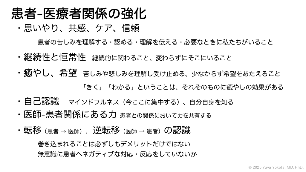 患者-医療者関係の強化 ・思いやり、共感、ケア、信頼 患者の苦しみを理解する・認める・理解を伝える・必要なときに私たちがいること ・継続性と恒常性 ・癒やし、希望 継続的に関わること、変わらずにそこにいること 苦しみや悲しみを理解し受け止める、少なからず希望をあたえること 「きく」「わかる」ということは、それそのものに癒やしの効果がある ・自己認識 マインドフルネス(今ここに集中する)、自分自身を知る ・医師-患者関係にある力 患者との関係において力を共有する ・転移(患者 → 医師)、 逆転移(医師 → 患者)の認識 巻き込まれることは必ずしもデメリットだけではない 無意識に患者へネガティブな対応・反応をしていないか © 2026 Yuya Yokota, MD, PhD. #49.