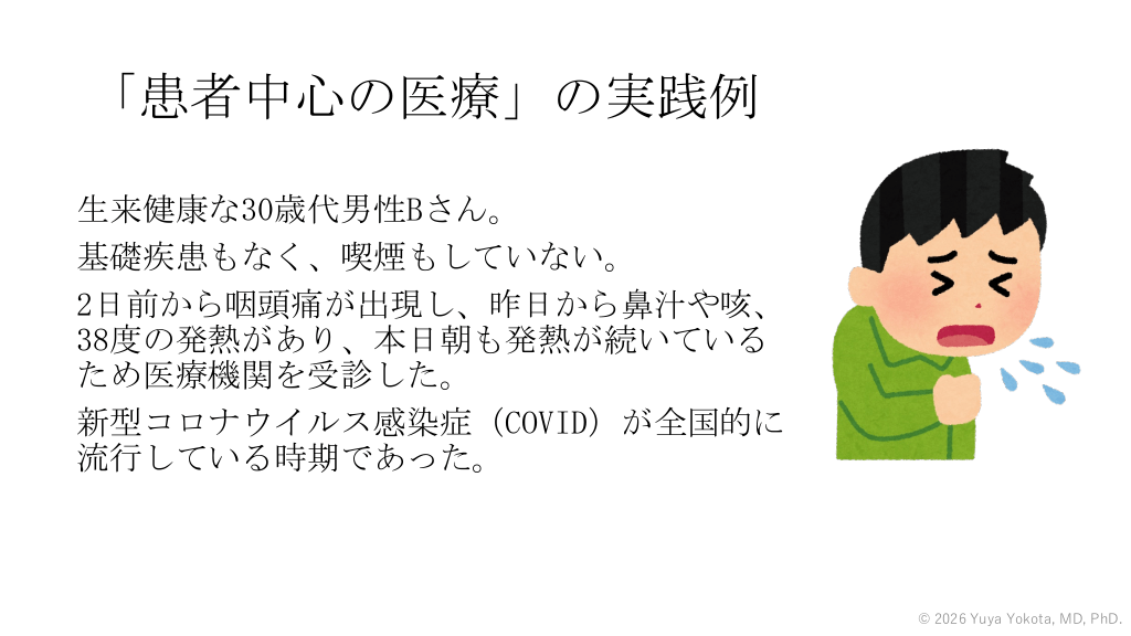 「患者中心の医療」の実践例 生来健康な30歳代男性Bさん。 基礎疾患もなく、喫煙もしていない。 2日前から咽頭痛が出現し、昨日から鼻汁や咳、 38度の発熱があり、本日朝も発熱が続いている ため医療機関を受診した。 新型コロナウイルス感染症(COVID)が全国的に 流行している時期であった。 © 2026 Yuya Yokota, MD, PhD. #50.
