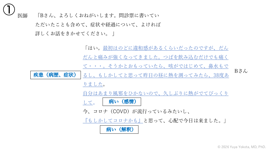 ① 医師 「Bさん、よろしくおねがいします。問診票に書いてい ただいたことも含めて、症状や経過について、よければ 詳しくお話をきかせてください。 」 「はい。最初はのどに違和感があるくらいだったのですが、だん だんと痛みが強くなってきました。つばを飲み込むだけでも痛く て・・・。そうかとおもっていたら、咳がではじめて、⿐⽔もで 疾患(病歴、症状) るし、もしかしてと思って昨⽇の昼に熱を測ってみたら、38度あ Bさん りました。 ⾃分はあまり⾵邪をひかないので、久しぶりに熱がでてびっくり して。 病い(感情) 今、コロナ(COVD)が流⾏っているみたいし、 『もしかしてコロナかも』と思って、⼼配で今⽇は来ました。」 病い(解釈) © 2026 Yuya Yokota, MD, PhD. #51.