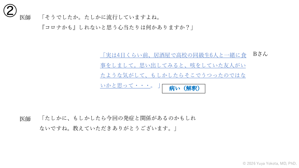② 医師 「そうでしたか。たしかに流⾏していますよね。 『コロナかも』しれないと思う⼼当たりは何かありますか?」 「実は4⽇くらい前、居酒屋で⾼校の同級⽣6⼈と⼀緒に⾷ Bさん 事をしまして。思い出してみると、咳をしていた友⼈がい たような気がして、もしかしたらそこでうつったのではな いかと思って・・・。 」 医師 病い(解釈) 「たしかに、もしかしたら今回の発症と関係があるのかもしれ ないですね。教えていただきありがとうございます。」 © 2026 Yuya Yokota, MD, PhD. #52.