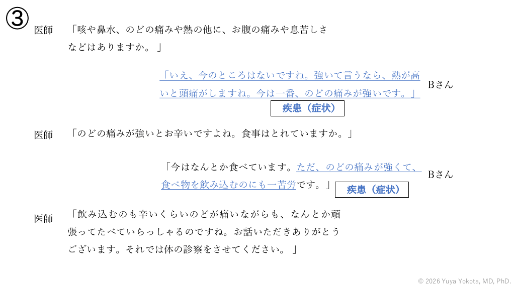 ③ 医師 「咳や⿐⽔、のどの痛みや熱の他に、お腹の痛みや息苦しさ などはありますか。 」 「いえ、今のところはないですね。強いて⾔うなら、熱が⾼ いと頭痛がしますね。今は⼀番、のどの痛みが強いです。」 Bさん 疾患(症状) 医師 「のどの痛みが強いとお⾟いですよね。⾷事はとれていますか。」 「今はなんとか⾷べています。ただ、のどの痛みが強くて、 ⾷べ物を飲み込むのにも⼀苦労です。」 医師 Bさん 疾患(症状) 「飲み込むのも⾟いくらいのどが痛いながらも、なんとか頑 張ってたべていらっしゃるのですね。お話いただきありがとう ございます。それでは体の診察をさせてください。 」 © 2026 Yuya Yokota, MD, PhD. #53.