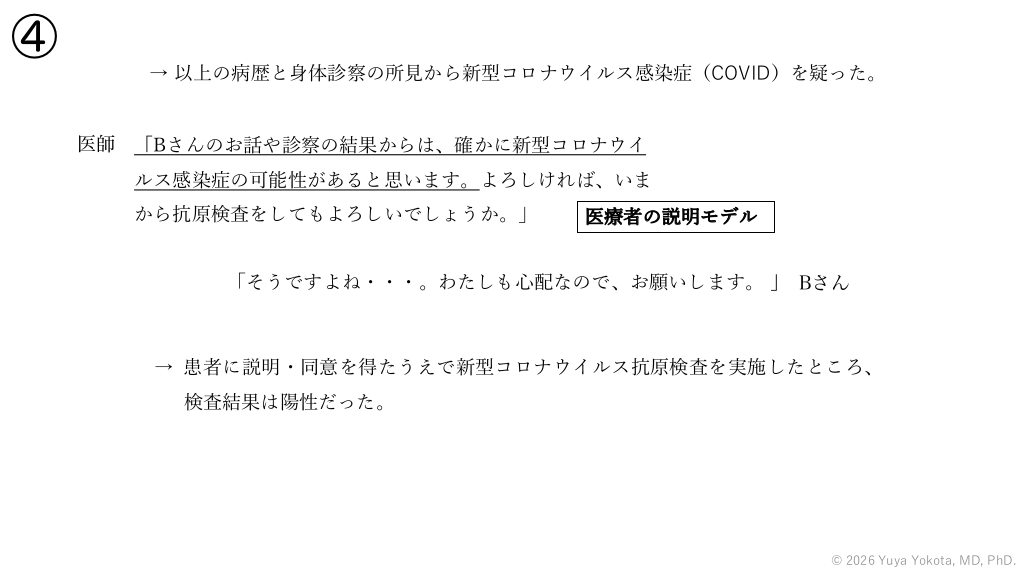 ④ → 以上の病歴と⾝体診察の所⾒から新型コロナウイルス感染症(COVID)を疑った。 医師 「Bさんのお話や診察の結果からは、確かに新型コロナウイ ルス感染症の可能性があると思います。よろしければ、いま から抗原検査をしてもよろしいでしょうか。」 医療者の説明モデル 「そうですよね・・・。わたしも⼼配なので、お願いします。 」 Bさん → 患者に説明・同意を得たうえで新型コロナウイルス抗原検査を実施したところ、 検査結果は陽性だった。 © 2026 Yuya Yokota, MD, PhD. #54.