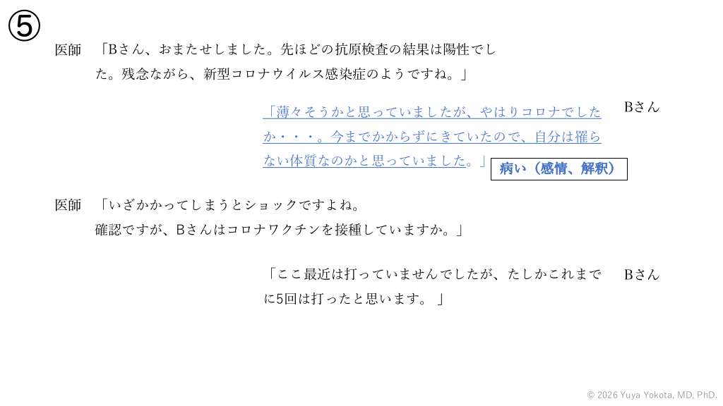 ⑤ 医師 「Bさん、おまたせしました。先ほどの抗原検査の結果は陽性でし た。残念ながら、新型コロナウイルス感染症のようですね。」 「薄々そうかと思っていましたが、やはりコロナでした Bさん か・・・。今までかからずにきていたので、⾃分は罹ら ない体質なのかと思っていました。」 病い(感情、解釈) 医師 「いざかかってしまうとショックですよね。 確認ですが、Bさんはコロナワクチンを接種していますか。」 「ここ最近は打っていませんでしたが、たしかこれまで Bさん に5回は打ったと思います。 」 © 2026 Yuya Yokota, MD, PhD. #55.