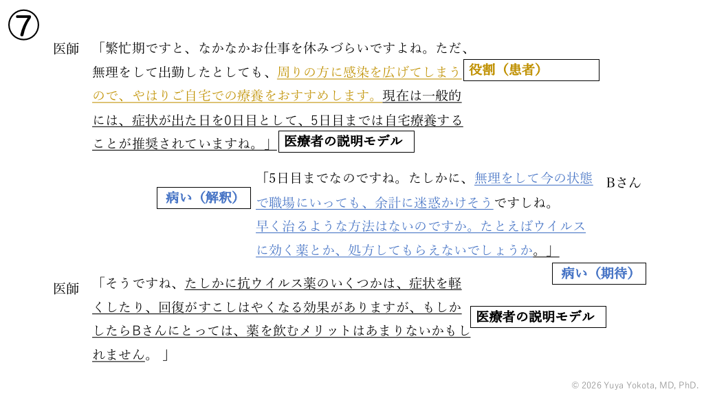 ⑦ 医師 「繁忙期ですと、なかなかお仕事を休みづらいですよね。ただ、 無理をして出勤したとしても、周りの⽅に感染を広げてしまう 役割(患者) ので、やはりご⾃宅での療養をおすすめします。現在は⼀般的 には、症状が出た⽇を0⽇⽬として、5⽇⽬までは⾃宅療養する ことが推奨されていますね。」 医療者の説明モデル 「5⽇⽬までなのですね。たしかに、無理をして今の状態 Bさん 病い(解釈) で職場にいっても、余計に迷惑かけそうですしね。 早く治るような⽅法はないのですか。たとえばウイルス に効く薬とか、処⽅してもらえないでしょうか。」 医師 「そうですね、たしかに抗ウイルス薬のいくつかは、症状を軽 くしたり、回復がすこしはやくなる効果がありますが、もしか したらBさんにとっては、薬を飲むメリットはあまりないかもし 病い(期待) 医療者の説明モデル れません。 」 © 2026 Yuya Yokota, MD, PhD. #57.