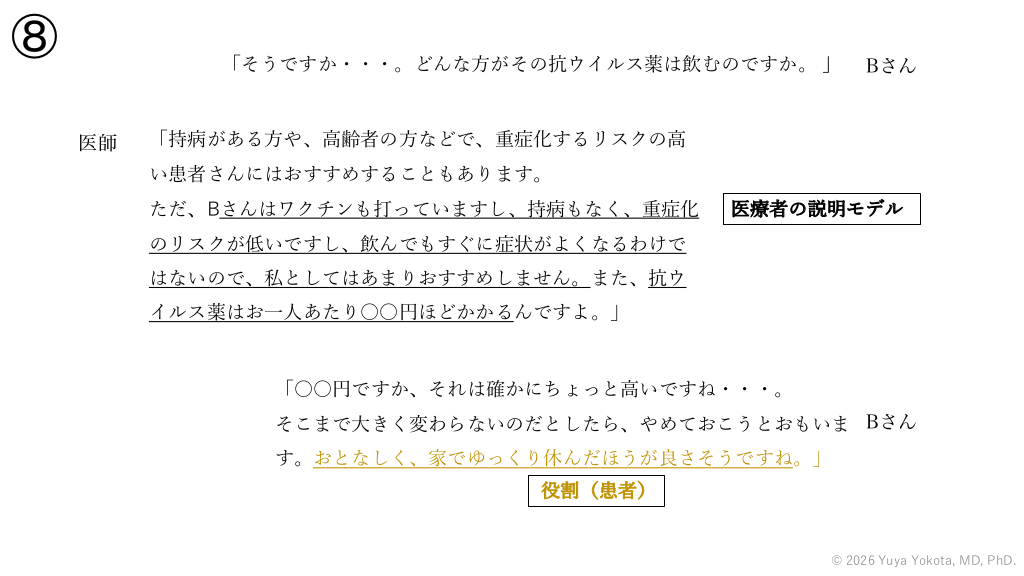 ⑧ 「そうですか・・・。どんな⽅がその抗ウイルス薬は飲むのですか。 」 医師 Bさん 「持病がある⽅や、⾼齢者の⽅などで、重症化するリスクの⾼ い患者さんにはおすすめすることもあります。 ただ、Bさんはワクチンも打っていますし、持病もなく、重症化 医療者の説明モデル のリスクが低いですし、飲んでもすぐに症状がよくなるわけで はないので、私としてはあまりおすすめしません。また、抗ウ イルス薬はお⼀⼈あたり〇〇円ほどかかるんですよ。」 「〇〇円ですか、それは確かにちょっと⾼いですね・・・。 そこまで⼤きく変わらないのだとしたら、やめておこうとおもいま Bさん す。おとなしく、家でゆっくり休んだほうが良さそうですね。」 役割(患者) © 2026 Yuya Yokota, MD, PhD. #58.