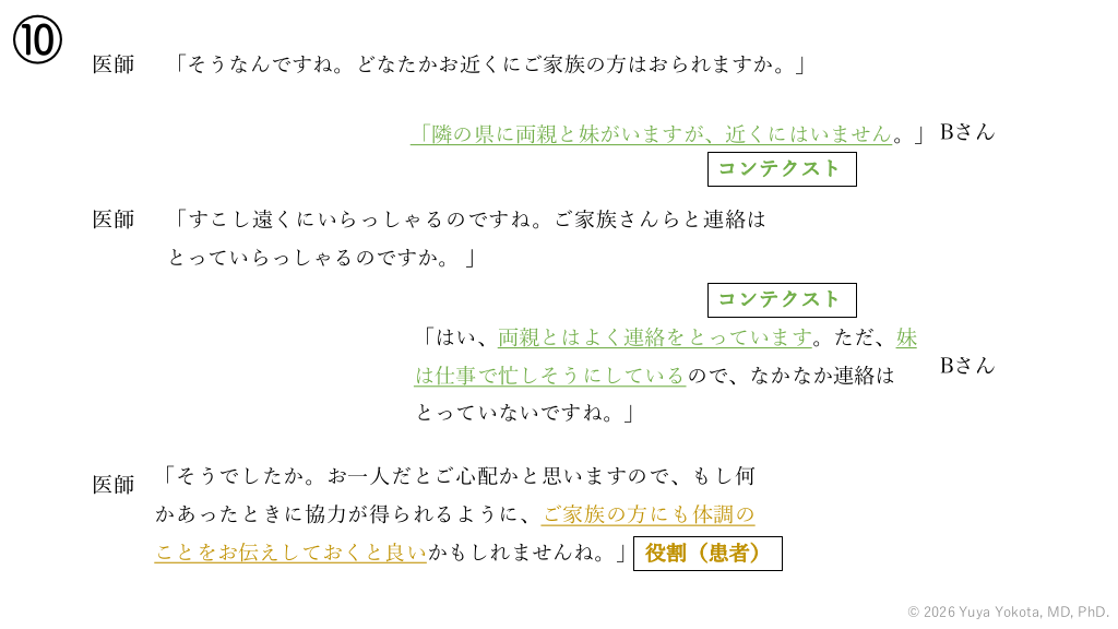 ⑩ 医師 「そうなんですね。どなたかお近くにご家族の⽅はおられますか。」 「隣の県に両親と妹がいますが、近くにはいません。」 Bさん コンテクスト 医師 「すこし遠くにいらっしゃるのですね。ご家族さんらと連絡は とっていらっしゃるのですか。 」 コンテクスト 「はい、両親とはよく連絡をとっています。ただ、妹 は仕事で忙しそうにしているので、なかなか連絡は Bさん とっていないですね。」 医師 「そうでしたか。お⼀⼈だとご⼼配かと思いますので、もし何 かあったときに協⼒が得られるように、ご家族の⽅にも体調の ことをお伝えしておくと良いかもしれませんね。」 役割(患者) © 2026 Yuya Yokota, MD, PhD. #60.