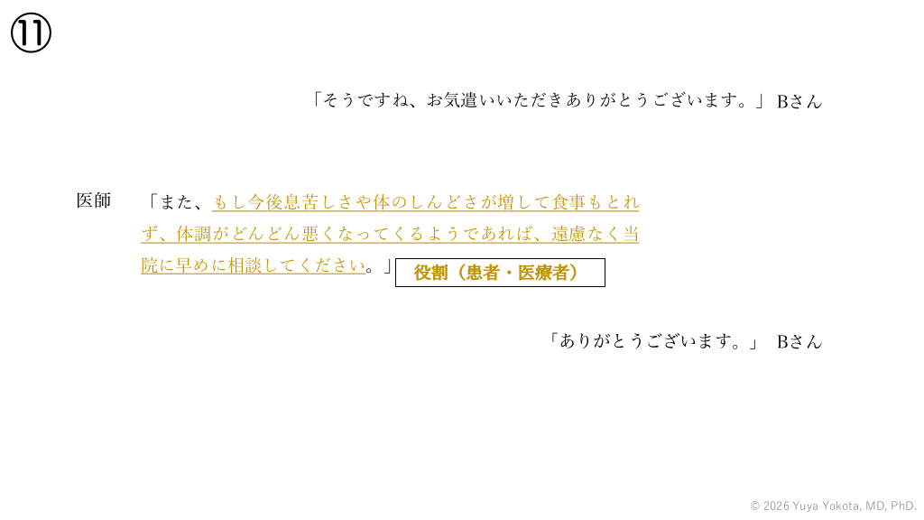⑪ 「そうですね、お気遣いいただきありがとうございます。」 Bさん 医師 「また、もし今後息苦しさや体のしんどさが増して⾷事もとれ ず、体調がどんどん悪くなってくるようであれば、遠慮なく当 院に早めに相談してください。」 役割(患者・医療者) 「ありがとうございます。」 Bさん © 2026 Yuya Yokota, MD, PhD. #61.
