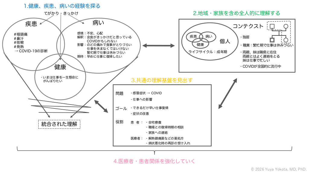 1.健康、疾患、病いの経験を探る 2.地域・家族を含め全人的に理解する てがかり・きっかけ 病い 疾患 コンテクスト 感情:不安、心配 解釈:会食がきっかけだと思っている COVIDかもしれない 影響:のどの痛みで食事がとりづらい 仕事を休まなくてはいけない 繁忙期で仕事は休みづらい 期待:早めに仕事に復帰したい #咽頭痛 #鼻汁 #咳嗽 #発熱 → COVID-19の診断 疾患 病い 健康 個人 ライフサイクル:成年期 健康 ・独居 ・職業:繁忙期で仕事は休みづらい ・両親、妹は隣県に在住 両親とはよく連絡をとる 妹は仕事で忙しい ・COVIDが全国的に流行中 ・いまは仕事を一生懸命に がんばりたい 3.共通の理解基盤を見出す 問題 ・感冒症状 → COVID ・仕事への影響 ゴール ・できるだけ早い仕事復帰 ・症状の改善 統合された理解 役割 患 者 : ・自宅療養 ・職場との復帰時期の相談 ・家族への連絡 医療者: ・解熱鎮痛薬などの薬処方 ・病状悪化時の再診の受け入れ 4.医療者・患者関係を強化していく © 2026 Yuya Yokota, MD, PhD. #62.