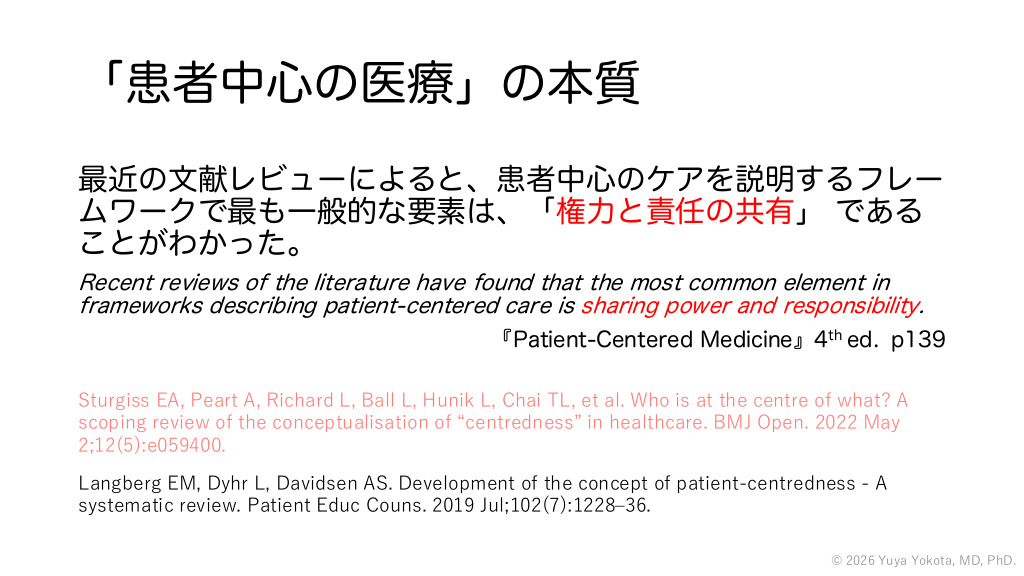 「患者中心の医療」の本質 最近の文献レビューによると、患者中心のケアを説明するフレー ムワークで最も一般的な要素は、「権力と責任の共有」 である ことがわかった。 Recent reviews of the literature have found that the most common element in frameworks describing patient-centered care is sharing power and responsibility. 『Patient-Centered Medicine』4th ed. p139 Sturgiss EA, Peart A, Richard L, Ball L, Hunik L, Chai TL, et al. Who is at the centre of what? A scoping review of the conceptualisation of “centredness” in healthcare. BMJ Open. 2022 May 2;12(5):e059400. Langberg EM, Dyhr L, Davidsen AS. Development of the concept of patient-centredness - A systematic review. Patient Educ Couns. 2019 Jul;102(7):1228‒36. © 2026 Yuya Yokota, MD, PhD. #67.
