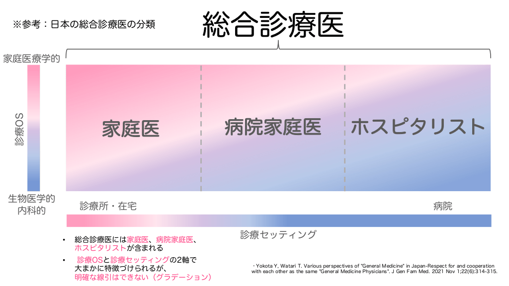 ※参考:日本の総合診療医の分類 総合診療医 診療OS 家庭医療学的 家庭医 生物医学的 内科的 病院家庭医 病院 診療所・在宅 • 総合診療医には家庭医、病院家庭医、 ホスピタリストが含まれる • 診療OSと診療セッティングの2軸で 大まかに特徴づけられるが、 明確な線引はできない(グラデーション) ホスピタリスト 診療セッティング ・Yokota Y, Watari T. Various perspectives of "General Medicine" in Japan-Respect for and cooperation with each other as the same "General Medicine Physicians". J Gen Fam Med. 2021 Nov 1;22(6):314-315.