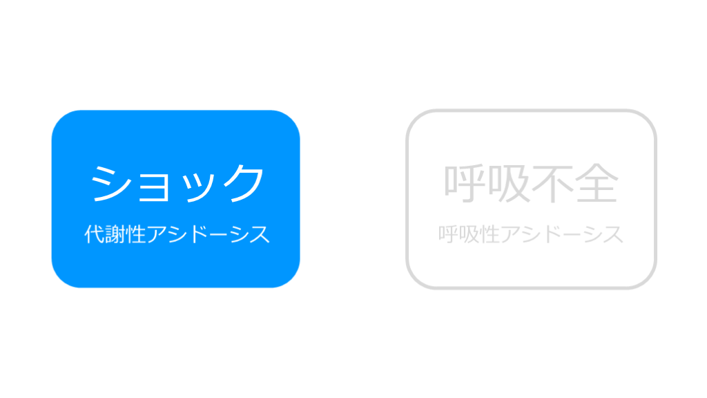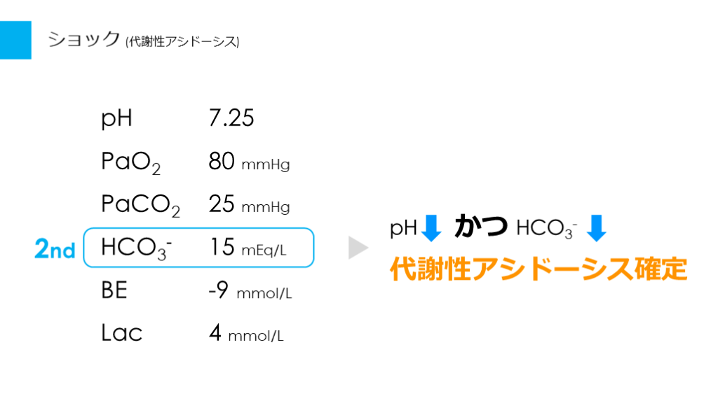 Lac 4 mmol/L pH HCO3- かつ ショック (代謝性アシドーシス)