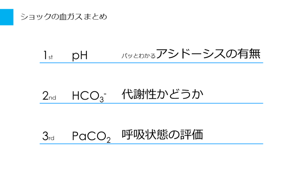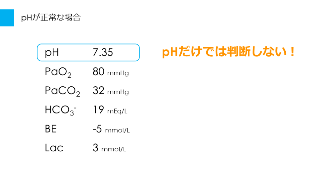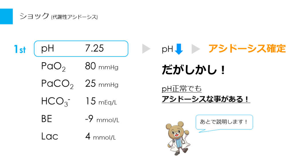 Lac 4 mmol/L ショック (代謝性アシドーシス) 1st アシドーシス確定 だがしかし! pH正常でも