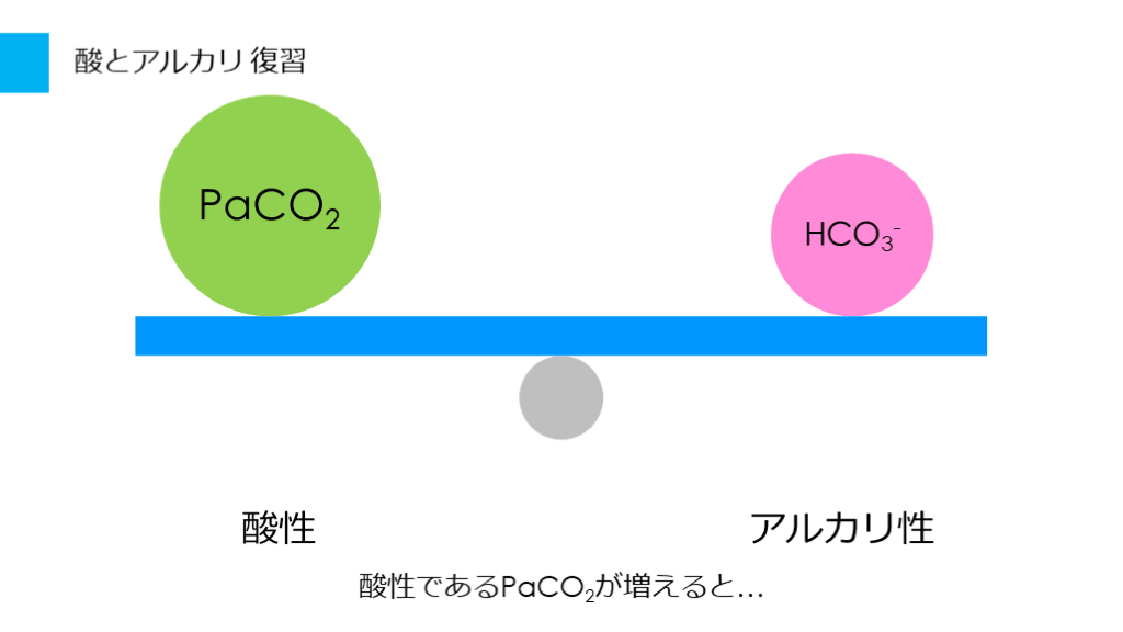 #15. HCO3- PaCO2 酸性 アルカリ性 酸性であるPaCO2が増えると… 酸とアルカリ 復習