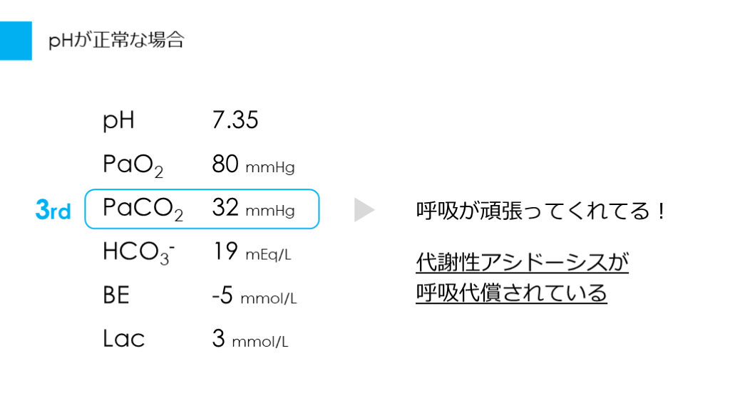 Lac 3 mmol/L pHが正常な場合 呼吸が頑張ってくれてる! 代謝性アシドーシスが