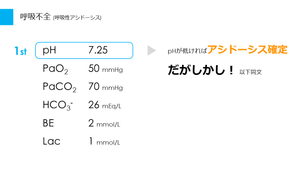 Lac 1 mmol/L 1st pHが低ければアシドーシス確定 だがしかし! 以下同文 呼吸不全 (呼吸性アシドーシス)
