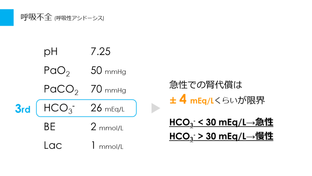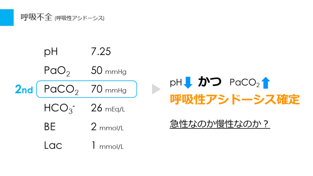 Lac 1 mmol/L 呼吸性アシドーシス確定 急性なのか慢性なのか? pH PaCO2 かつ 2nd 呼吸不全 (呼吸性アシドーシス)