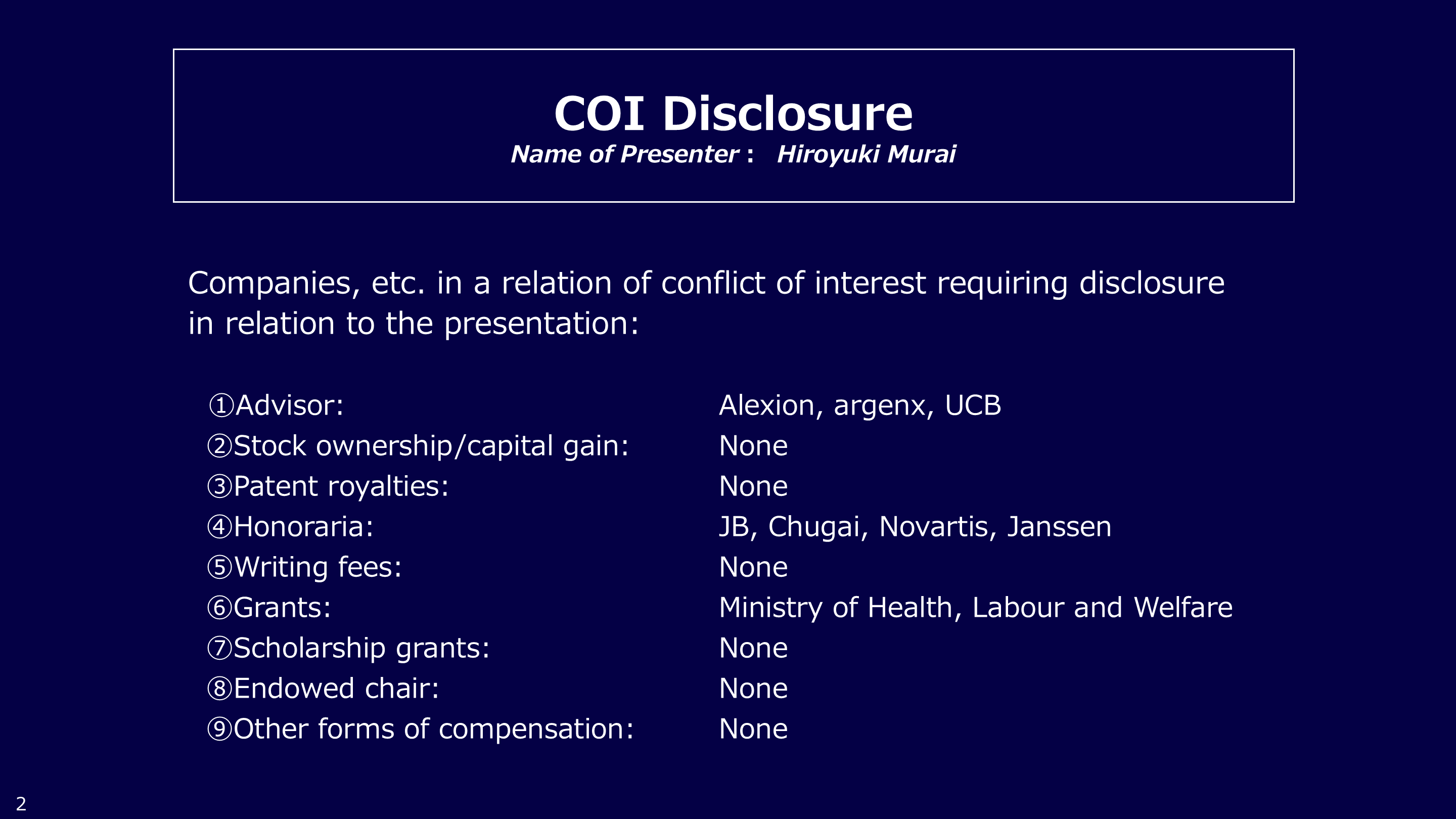 #2. COI DisclosureName of Presenter: Hiroyuki Murai Companies, etc. in a relation of conflict of interest requiring disclosure