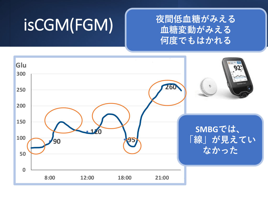 夜間低血糖がみえる 血糖変動がみえる 何度でもはかれる isCGM(FGM) Glu 300 260 250 200 150 100 90 120 SMBGでは、 「線」が見えてい なかった 95 50 0 8:00 12:00 18:00 21:00 1型と2型糖尿病の血糖変動の違い #11.