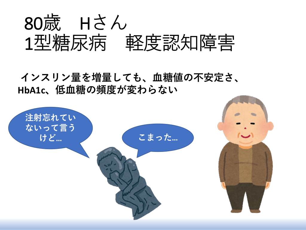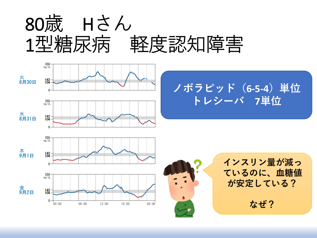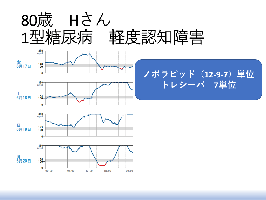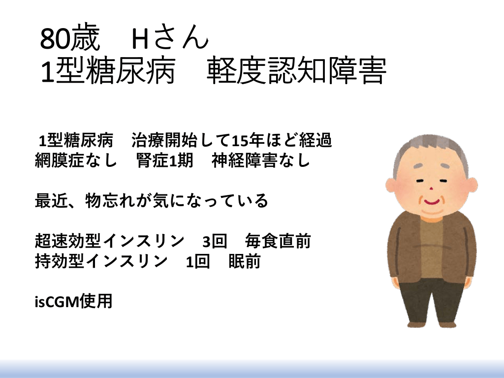 80歳 Hさん 1型糖尿病 軽度認知障害 1型糖尿病 治療開始して15年ほど経過 網膜症なし 腎症1期 神経障害なし 最近、物忘れが気になっている 超速効型インスリン 3回 毎食直前 持効型インスリン 1回 眠前 isCGM使用 #7.