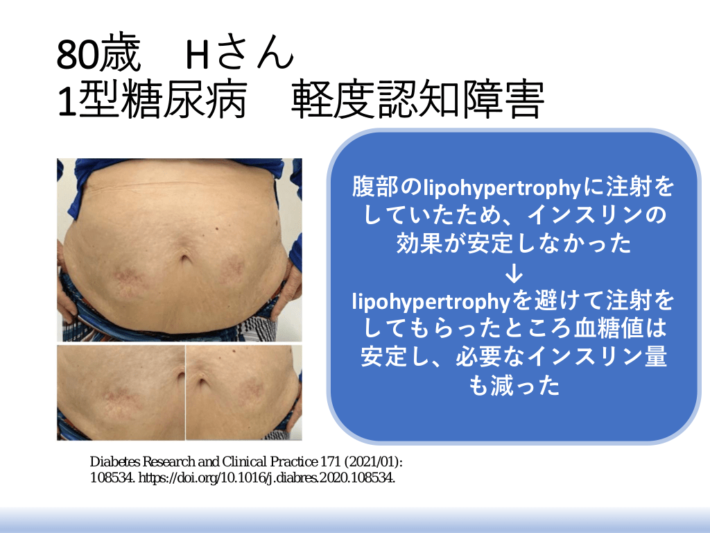 80歳 Hさん 1型糖尿病 軽度認知障害 ノボラピッド(6-5-4)単位 トレシーバ 7単位 インスリン量が減っ ているのに、血糖値 が安定している? なぜ? インスリン注射のlipohypertrophyと進歩 #17.