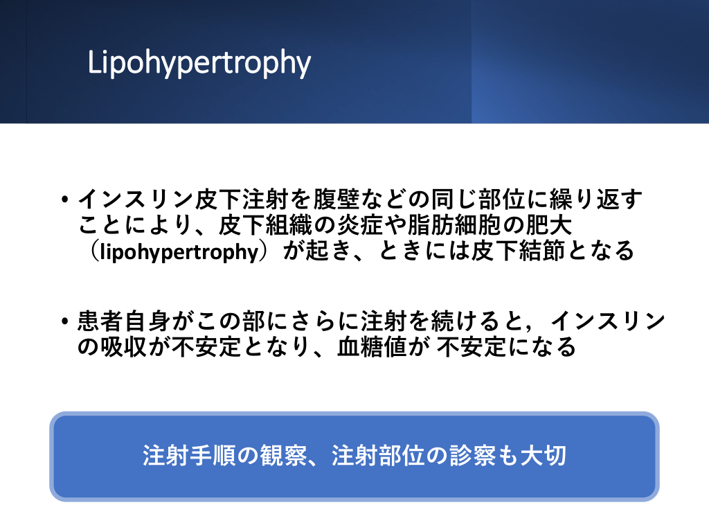Lipohypertrophy • インスリン皮下注射を腹壁などの同じ部位に繰り返す ことにより、皮下組織の炎症や脂肪細胞の肥大 (lipohypertrophy)が起き、ときには皮下結節となる • 患者自身がこの部にさらに注射を続けると,インスリン の吸収が不安定となり、血糖値が 不安定になる 注射手順の観察、注射部位の診察も大切 #18.
