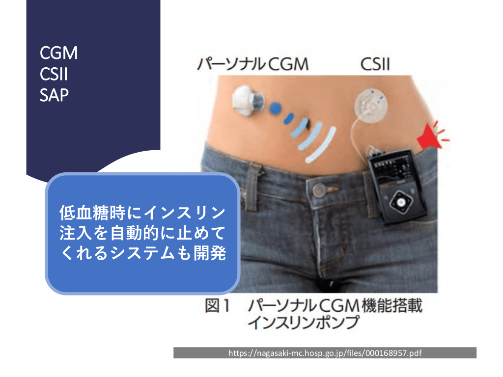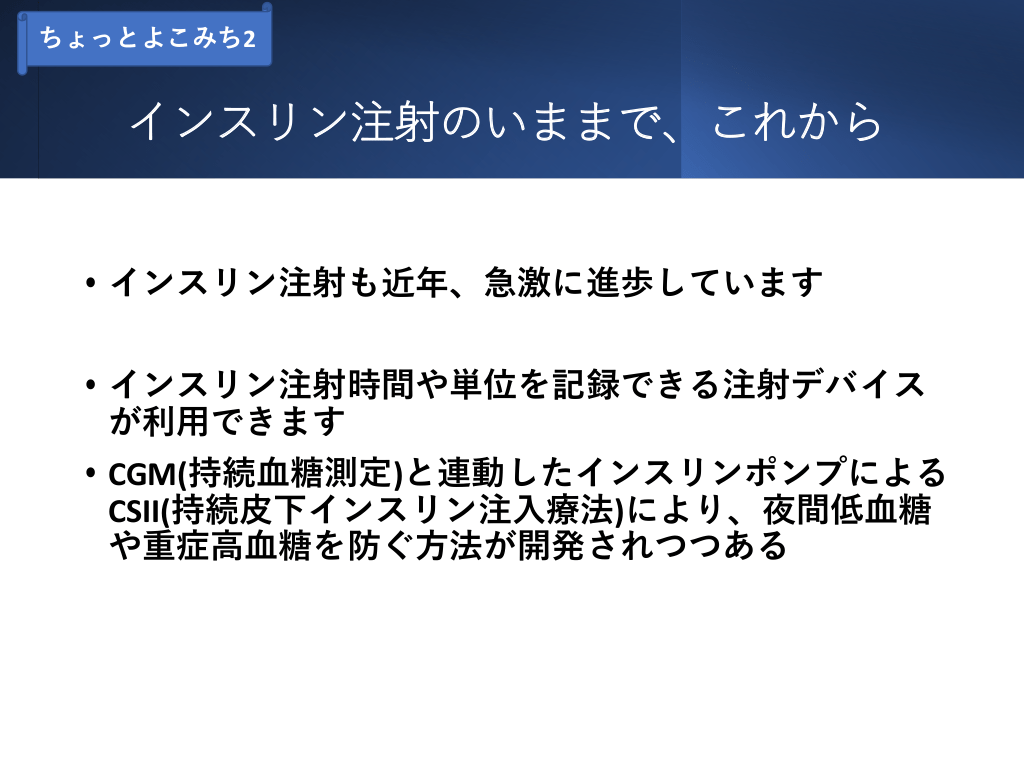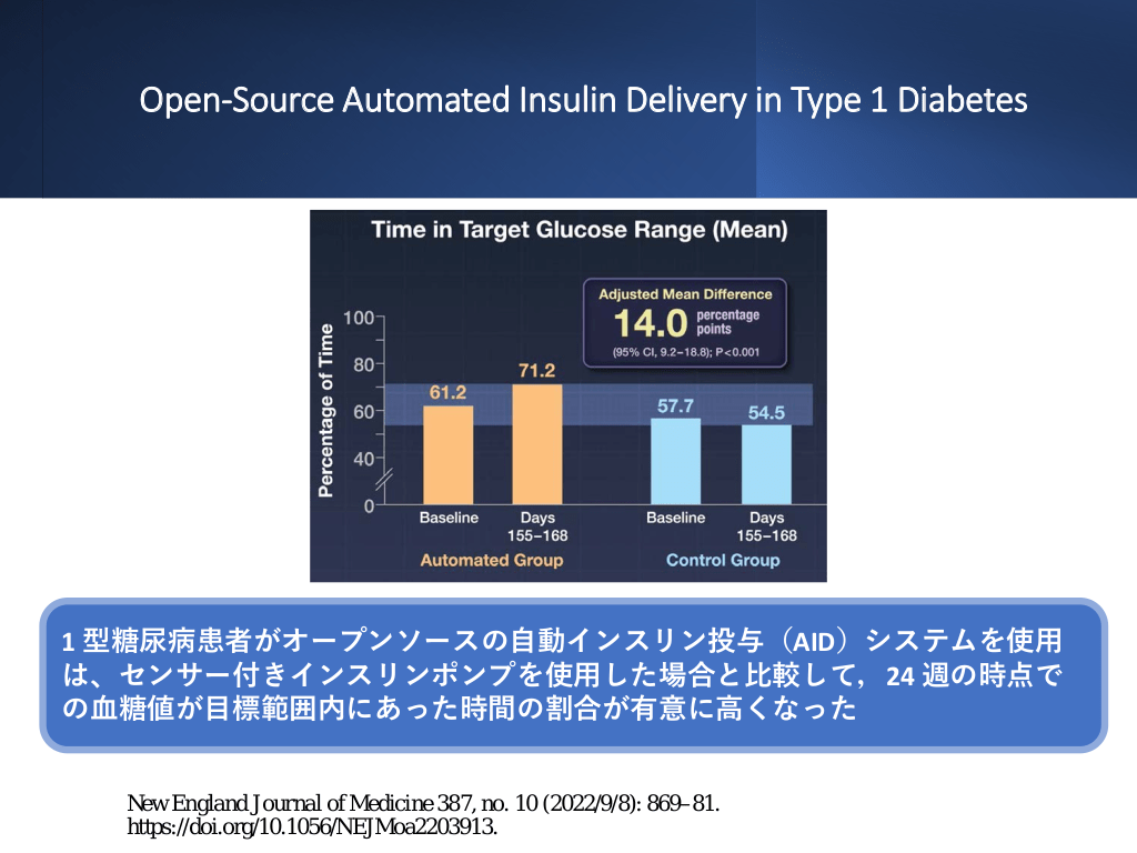 ちょっとよこみち2 インスリン注射のいままで、これから • インスリン注射も近年、急激に進歩しています • インスリン注射時間や単位を記録できる注射デバイス が利用できます • CGM(持続血糖測定)と連動したインスリンポンプによる CSII(持続皮下インスリン注入療法)により、夜間低血糖 や重症高血糖を防ぐ方法が開発されつつある スマートインスリンペンとCGMの役割 オープンソース自動インスリン投与の効果 #21. Open-Source Automated Insulin Delivery in Type 1 Diabetes 1 型糖尿病患者がオープンソースの自動インスリン投与(AID)システムを使用 は、センサー付きインスリンポンプを使用した場合と比較して,24 週の時点で の血糖値が目標範囲内にあった時間の割合が有意に高くなった New England Journal of Medicine 387, no. 10 (2022/9/8): 869–81. https://doi.org/10.1056/NEJMoa2203913 . #22.