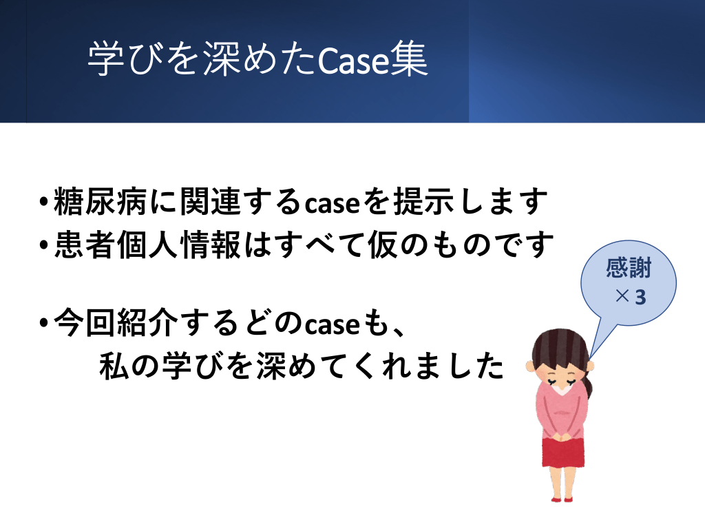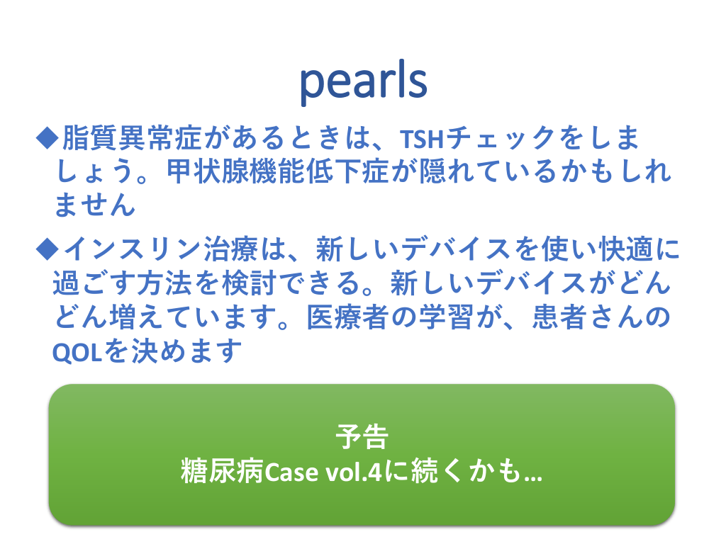 pearls 脂質異常症があるときは、TSHチェックをしま しょう。甲状腺機能低下症が隠れているかもしれ ません インスリン治療は、新しいデバイスを使い快適に 過ごす方法を検討できる。新しいデバイスがどん どん増えています。医療者の学習が、患者さんの QOLを決めます 予告 糖尿病Case vol.4に続くかも…