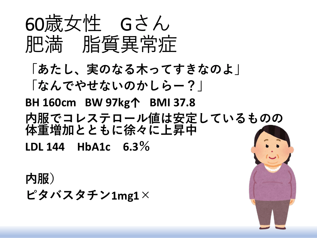 60歳女性 Gさん 肥満 脂質異常症 「あたし、実のなる木ってすきなのよ」 「なんでやせないのかしらー?」 BH 160cm BW 97kg↑ BMI 37.8 内服でコレステロール値は安定しているものの 体重増加とともに徐々に上昇中 LDL 144 HbA1c 6.3% 内服) ピタバスタチン1mg1× #4.