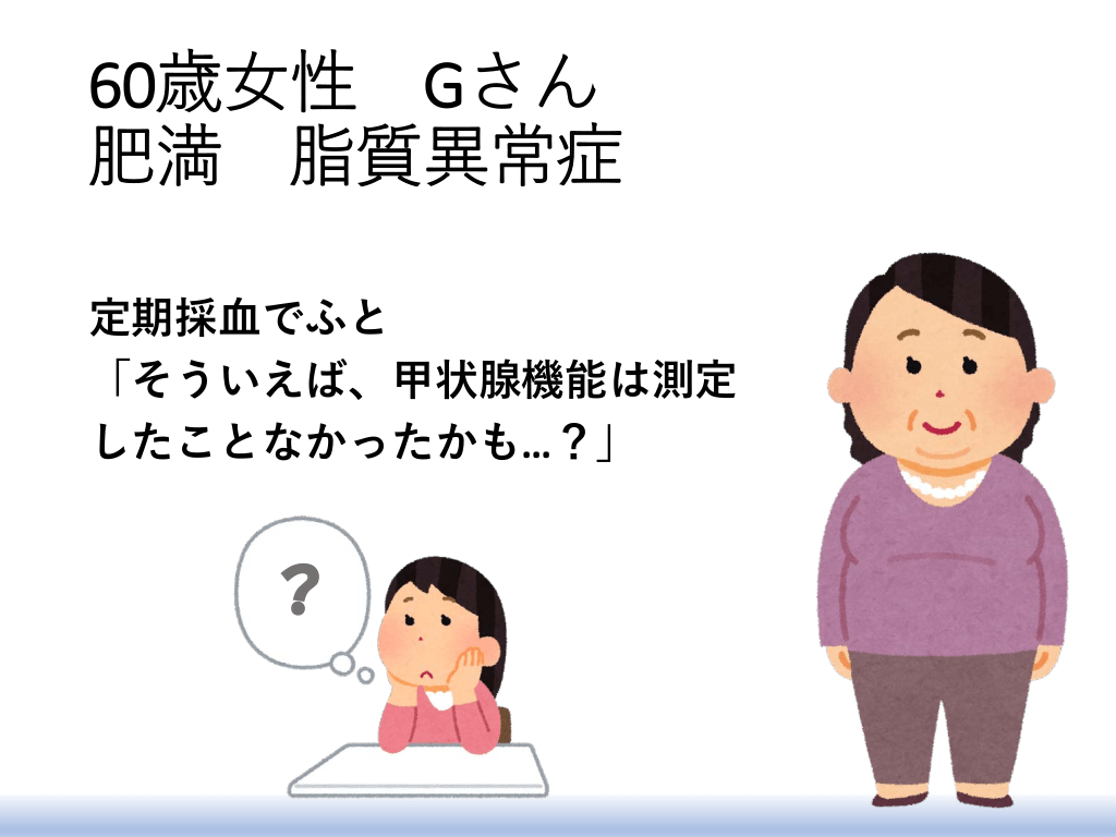 60歳女性 Gさん 肥満 脂質異常症 定期採血でふと 「そういえば、甲状腺機能は測定 したことなかったかも…?」 ? #5.
