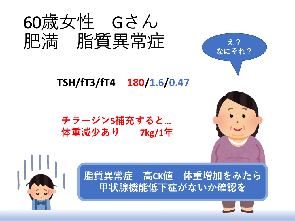 60歳女性 Gさん 肥満 脂質異常症 TSH/fT3/fT4 え? なにそれ? 180/1.6/0.47 チラージンS補充すると… 体重減少あり -7kg/1年 脂質異常症 高CK値 体重増加をみたら 甲状腺機能低下症がないか確認を 80歳Hさんの1型糖尿病と血糖管理 #6.